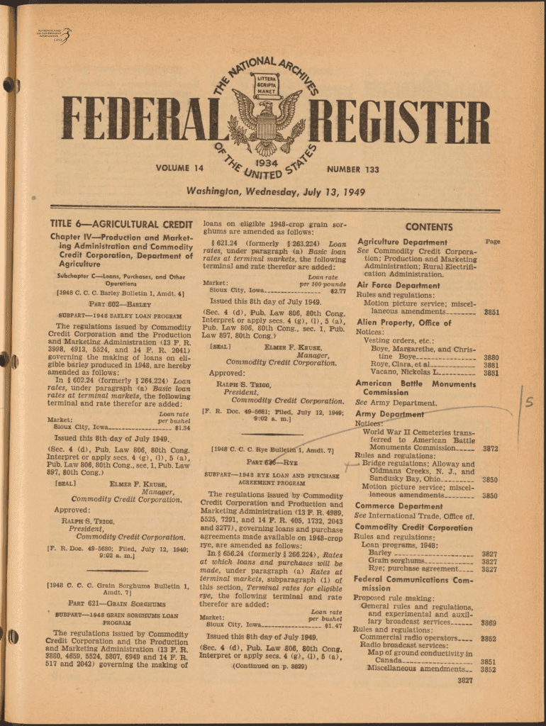 *VOLUME 14 UTICA SCRIPT MANET E “7J 934NUMBER 133Washington, Wednesday, July 13, 1949TITLE 6AGRICULTURAL CREDIT Chapter IV Production and Market ING Administration and Commodity Credit Corporation,