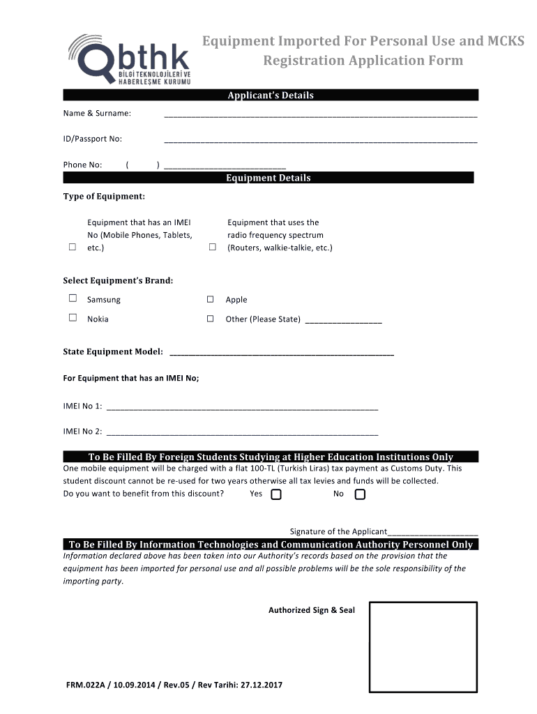 Equipment Imported For Personal Use and MOCKS Registration Application Form Applicants Details Name & Surname: ID/Passport No: Phone No:() Equipment Details Type of Equipment:Equipment that has an