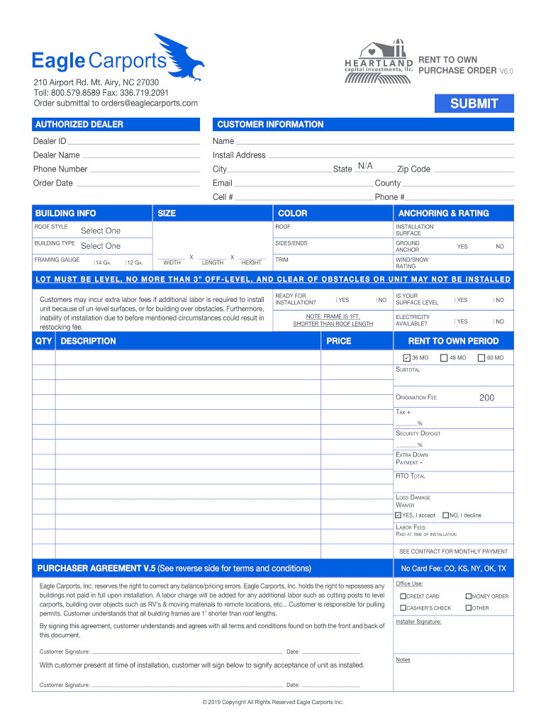 RENT TO OWN PURCHASE ORDER V6.0210 Airport Rd. Mt. Airy, NC 27030 Toll: 800.579.8589 Fax: 336.719.2091 Order submittal to orders eaglecarports.com AUTHORIZED DEALERSUBMIT CUSTOMER INFORMATIONDealer