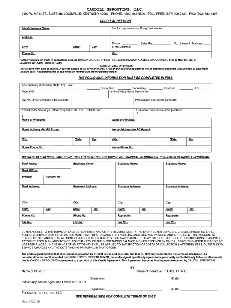 ResetCAUDILL SPROUTING, LLC.1402 W. MAIN ST., SUITE #B, LOUISVILLE, KENTUCKY 40203 PHONE: (502) 5615500 TOLL-FREE: (877) 9097333 FAX: (502) 5834405 CREDIT AGREEMENT Legal Business Name:If not a corporate