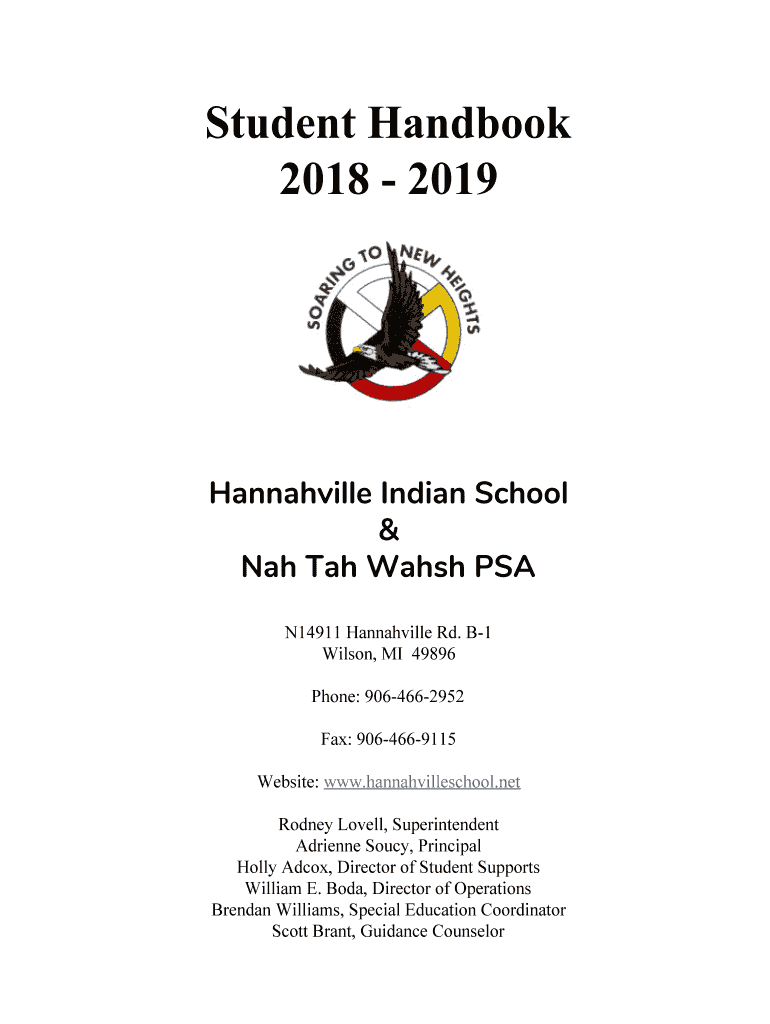 Student Handbook 2018 2019Hannahville Indian School & Nah TAH Walsh PSA N14911 Hannahville Rd. B1 Wilson, MI 49896 Phone: 9064662952 Fax: 9064669115 Website: www.hannahvilleschool.net Rodney Lovell,