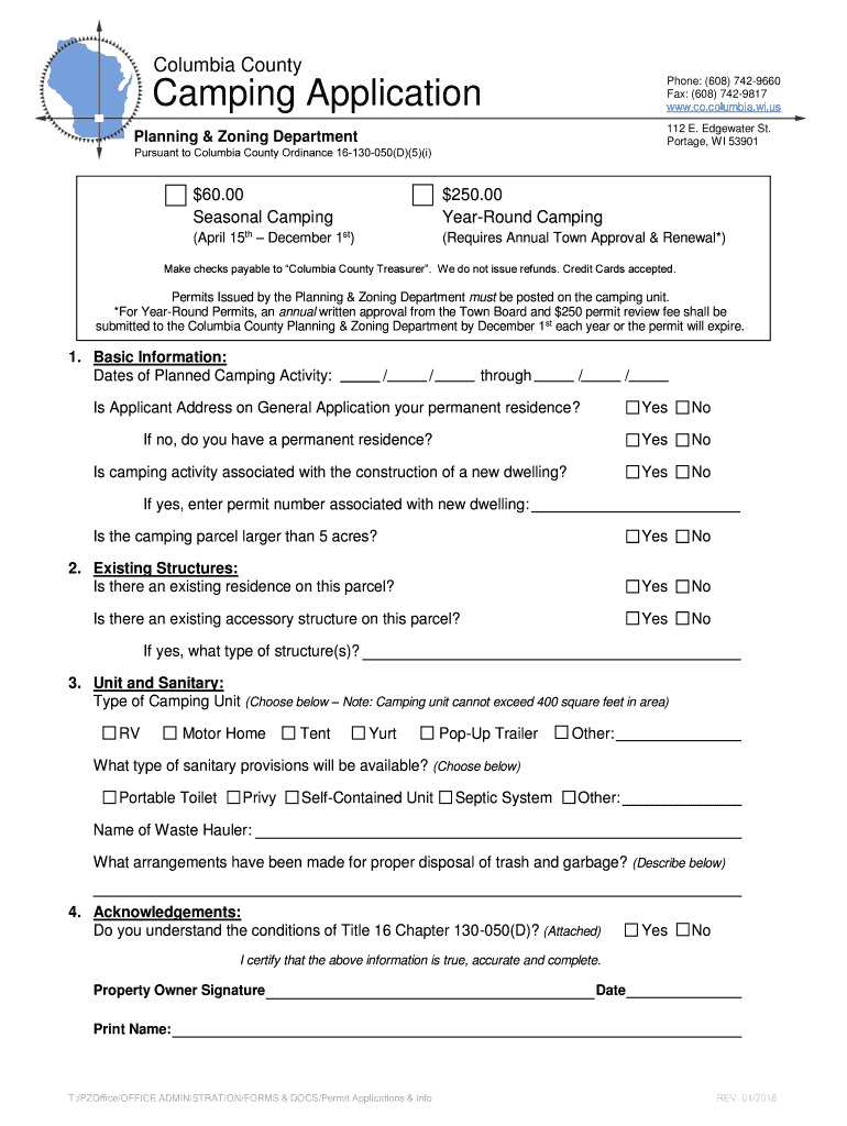 Columbia County Phone: (608) 7429660 Fax: (608) 7429817 www.co.columbia.wi.usCamping Application112 E. Edgewater St. Portage, WI 53901Planning & Zoning Department Pursuant to Columbia County Ordinance