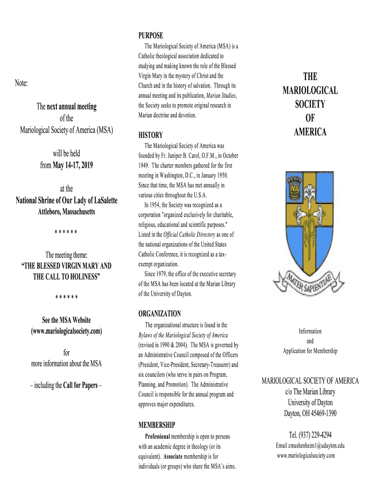 PURPOSENote: The next annual meeting of the Mario logical Society of America (MSA) will be held from May 1417, 2019 at the National Shrine of Our Lady of Lafayette Attleboro, Massachusetts ******