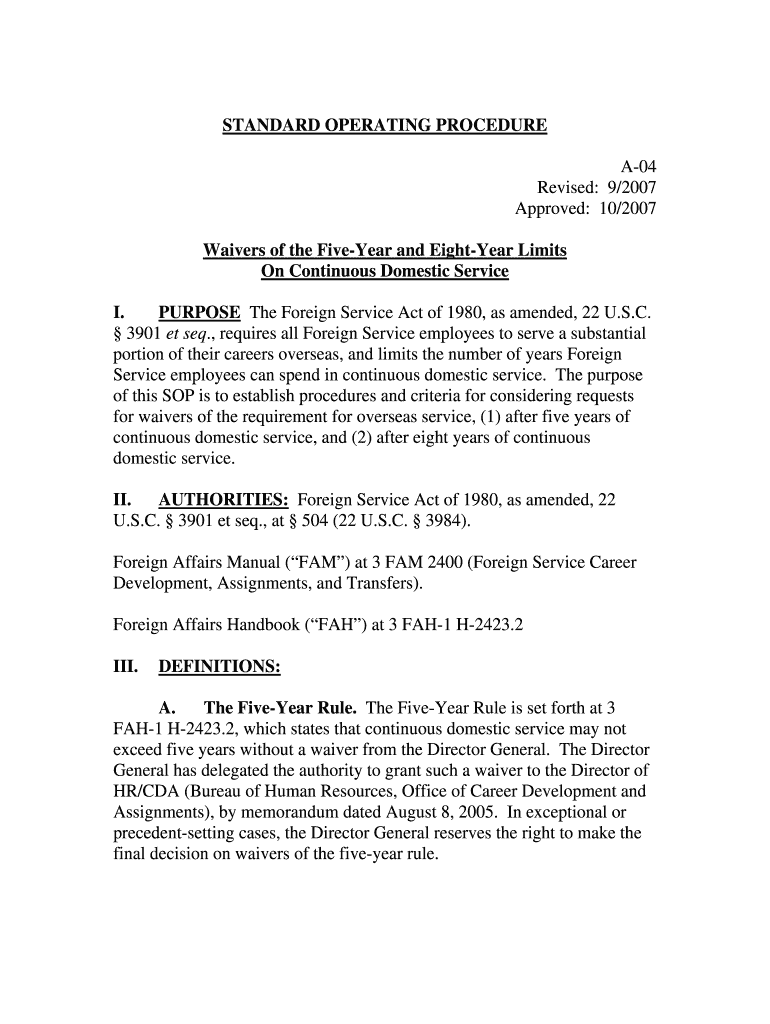 STANDARD OPERATING PROCEDURE A04 Revised: 9/2007 Approved: 10/2007 Waivers of the Livelier and Eight Year Limits On Continuous Domestic Service I. PURPOSE The Foreign Service Act of 1980, as amended,