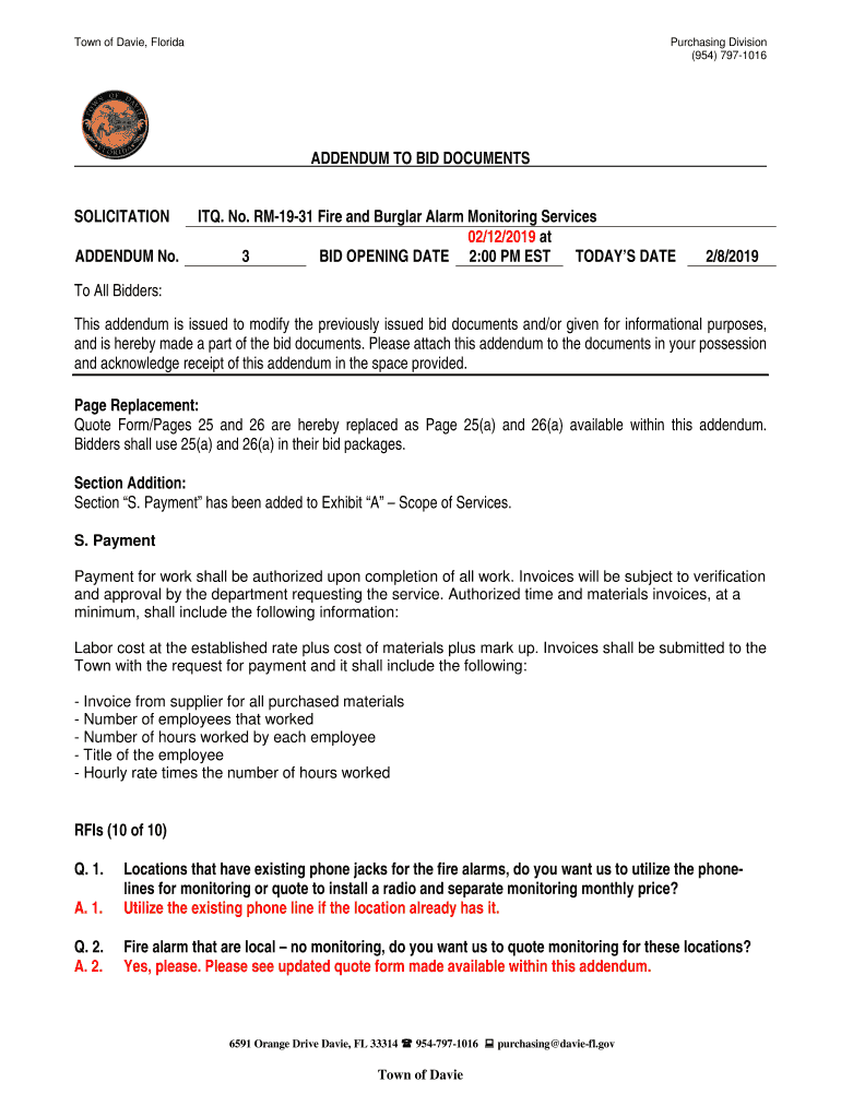 ADDENDUM No.IT. No. RM1931 Fire and Burglar Alarm Monitoring Services