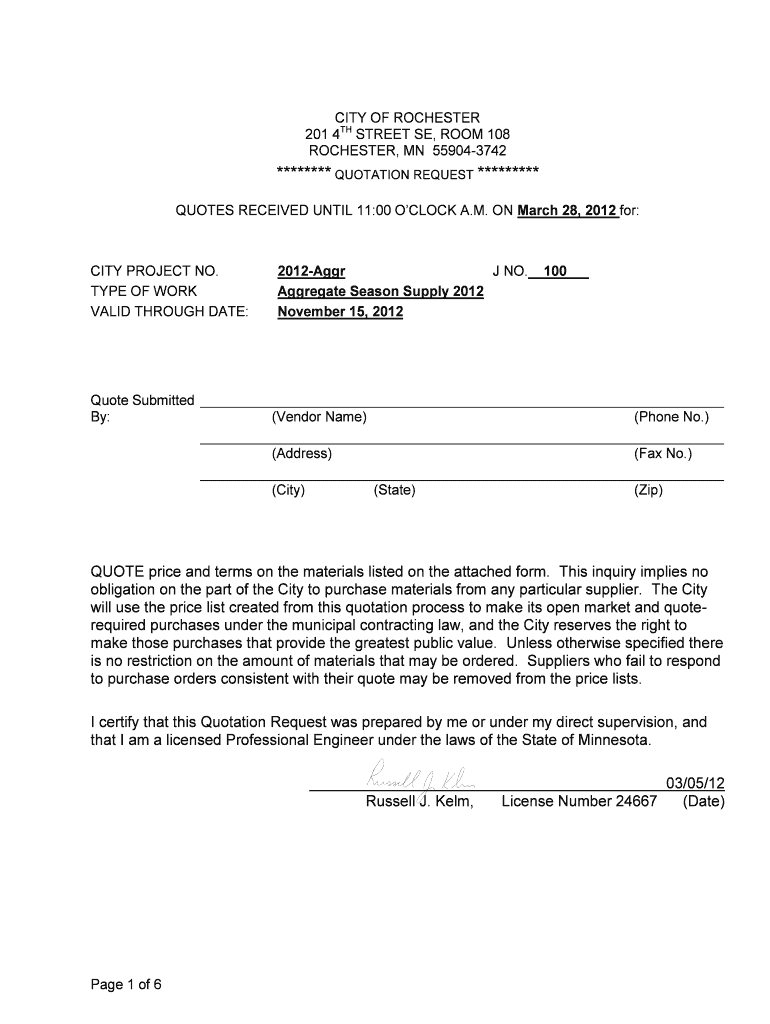 CITY OF ROCHESTER 201 4TH STREET SE, ROOM 108 ROCHESTER, MN 559043742******** QUOTATION REQUEST ********* QUOTES RECEIVED UNTIL 11:00 O'CLOCK. ON March 28, 2012, for:CITY PROJECT NO. TYPE OF WORK