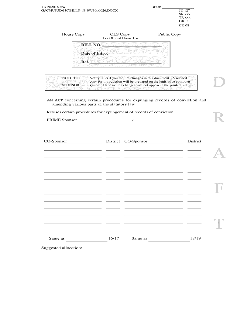11/19/2018 CRW G:CMUJUDJ10BILLS1819J10 0026. Doghouse Copy BPU# JU 127 SR xxx TR xxx DR F CR 08OLS Nonpublic Color Official House Rebill NO. Date of Intro. Ref. NOTE TO SPONSORNotify OLD if you require