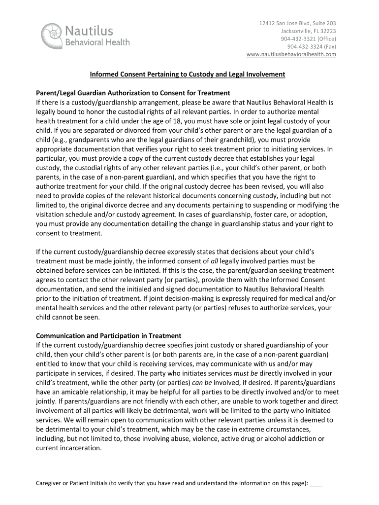 12412×San×Jose×Blvd, ×Suite×203Jacksonville,×FL 322239044323321 (Office)9044323324 (Fax)www.nautilusbehavioralhealth.comInformed×Consent×Pertaining×to Custody×and×Legal×InvolvementParent/Legal×Guardian×Authorization×to Consent×for×Treatment×there×is a custody/guardianship×arrangement,