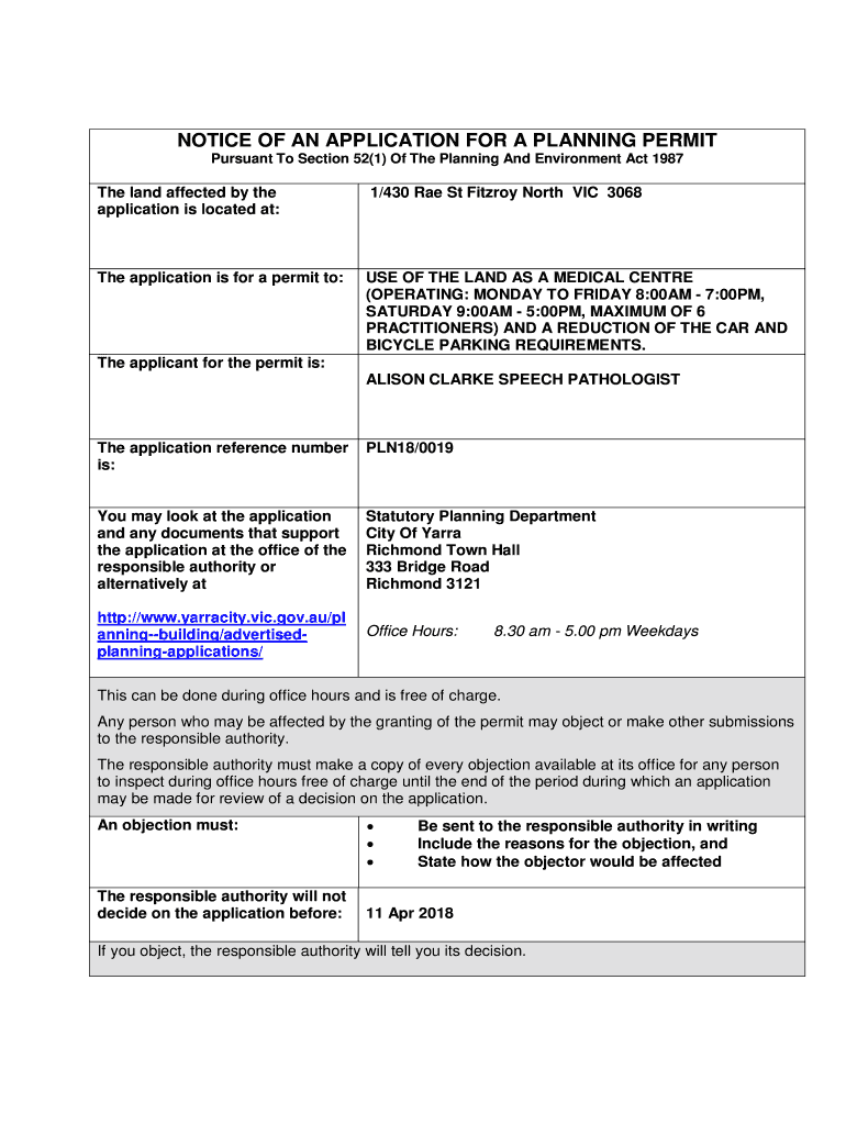 NOTICE OF AN APPLICATION FOR A PLANNING PERMIT Pursuant To Section 52(1) Of The Planning And Environment Act 1987The land affected by the application is located at:1/430 Rae St Fitzroy North VIC 3068The