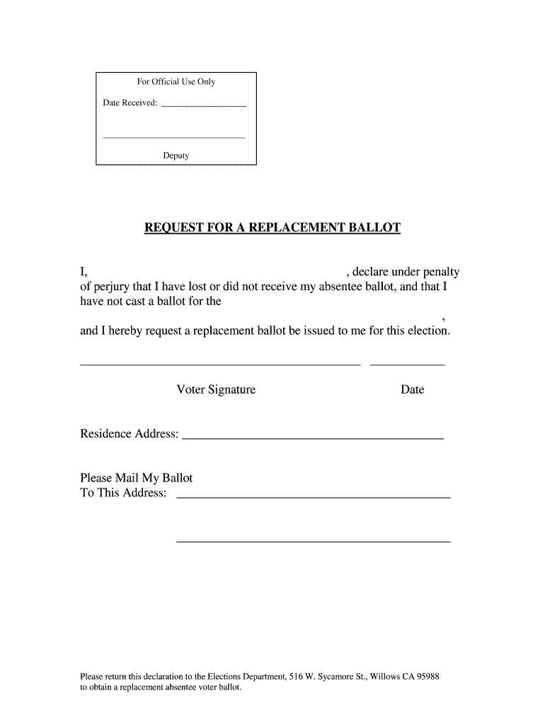 For Official Use Only Date Received: DeputyREQUEST FOR A REPLACEMENT BALLOT, declare under penalty of perjury that I have lost or did not receive my absentee ballot, and that I have not cast a ballot