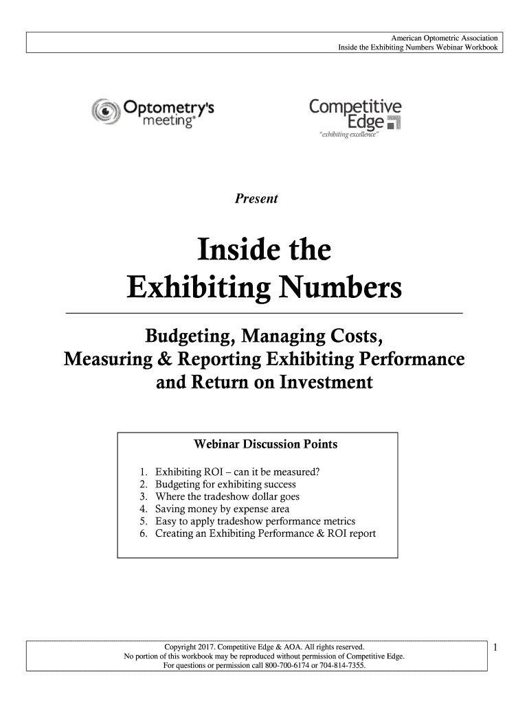 American Optometry Association Inside the Exhibiting Numbers Webinar WorkbookPresentInside the Exhibiting Numbers Budgeting, Managing Costs, Measuring & Reporting Exhibiting Performance and Return