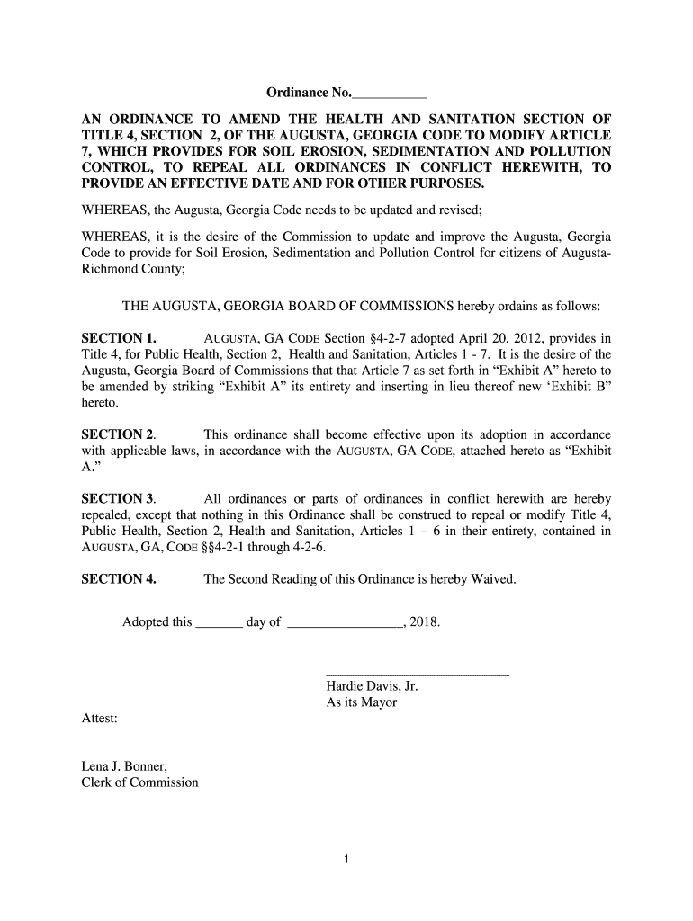 Ordinance No. AN ORDINANCE TO AMEND THE HEALTH AND SANITATION SECTION OF TITLE 4, SECTION 2, OF THE AUGUSTA, GEORGIA CODE TO MODIFY ARTICLE 7, WHICH PROVIDES FOR SOIL EROSION, SEDIMENTATION AND POLLUTION