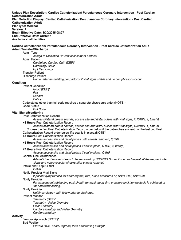 Get the free Unique Plan Description: Cardiac Catheterization/ Percutaneous Coronary Intervention...