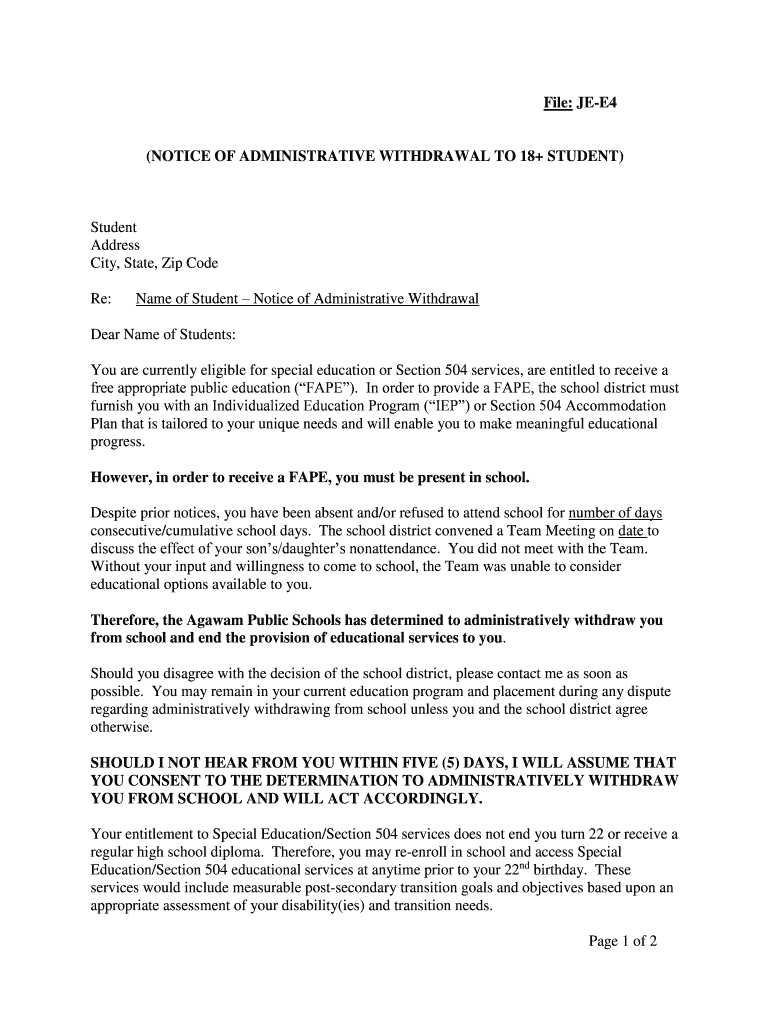 File: JEE4(NOTICE OF ADMINISTRATIVE WITHDRAWAL TO 18+ STUDENT)Student Address City, State, Zip Code Re:Name of Student Notice of Administrative WithdrawalDear Name of Students: You are currently eligible