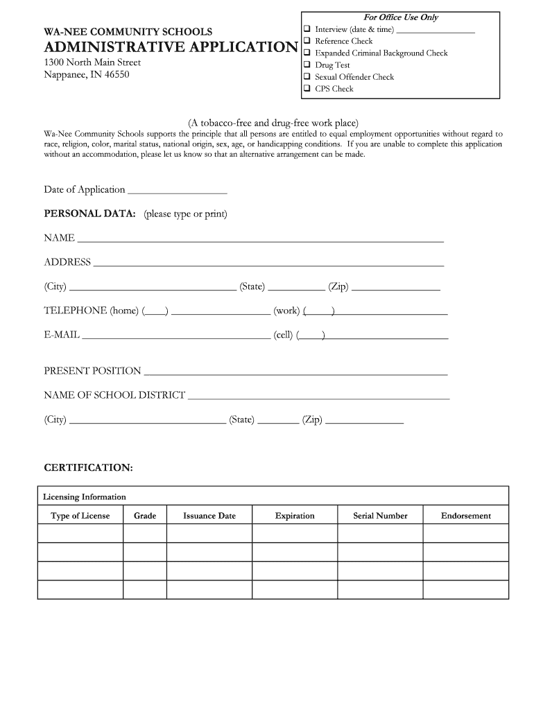 For Office Use OnlyFans COMMUNITY SCHOOLSADMINISTRATIVE APPLICATION 1300 North Main Street Japanese, IN 46550 Interview (date & time) Reference Check Expanded Criminal Background Check Drug Test Sexual
