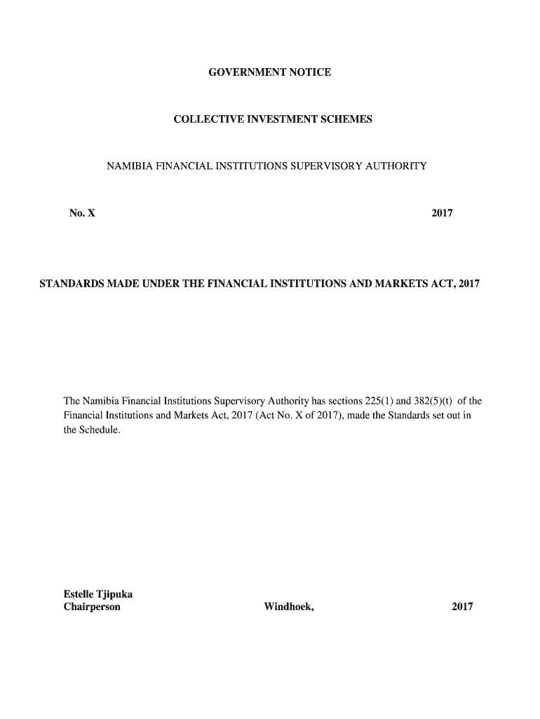 GOVERNMENT NOTICECOLLECTIVE INVESTMENT SCHEMESNAMIBIA FINANCIAL INSTITUTIONS SUPERVISORY AUTHORITY No. X2017STANDARDS MADE UNDER THE FINANCIAL INSTITUTIONS AND MARKETS ACT, 2017The Namibia Financial