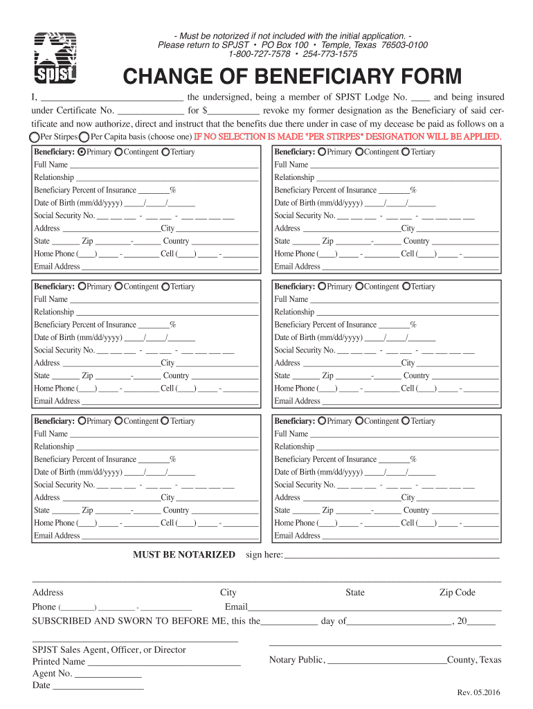 Must be motorized if not included with the initial application. Please return to PAST POB ox 100 Temple, Texas 765030100 18007277578 2547731575CHANGEOFBENEFICIARYFORMI, the undersigned, being a member