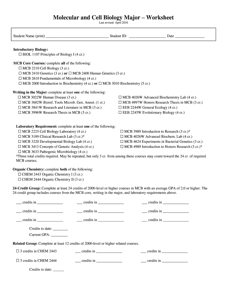 Molecular and Cell Biology Major Worksheet Last revised: April 2016Student Name (print) Student ID: Date Introductory Biology: BIOL 1107 Principles of Biology I (4 CR.) MCB Core Courses: complete