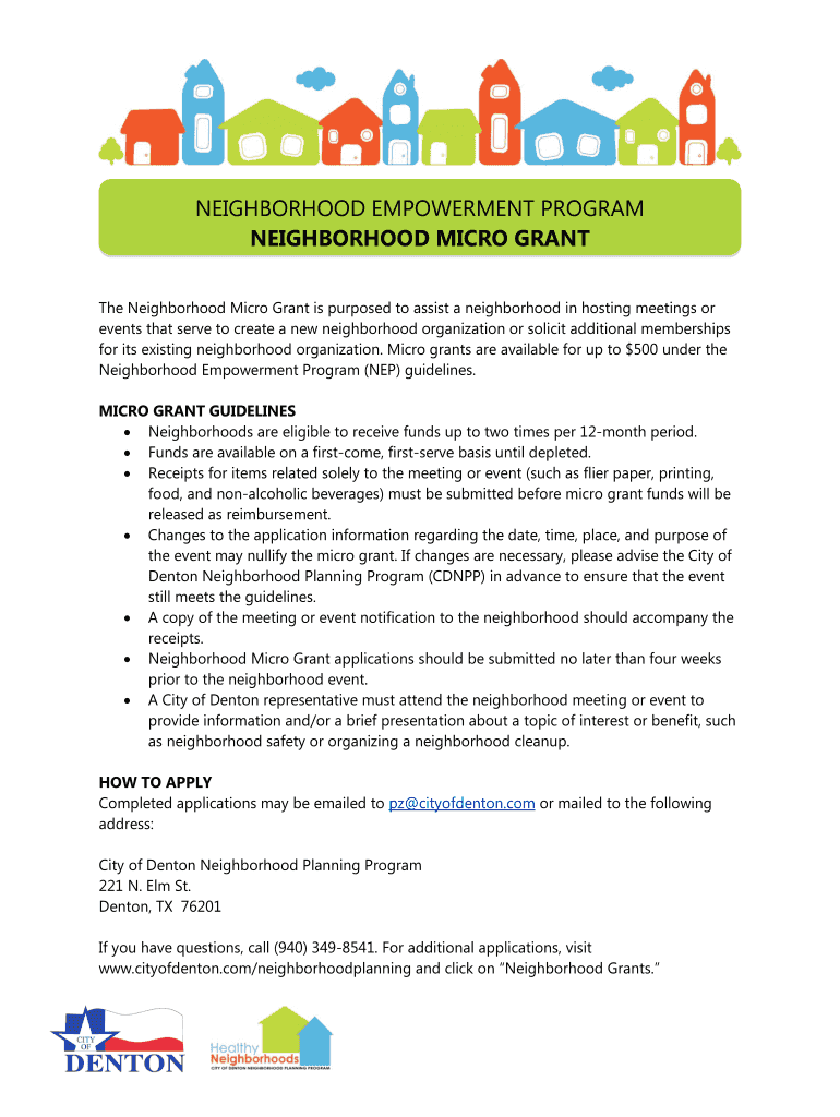 NEIGHBORHOOD EMPOWERMENT PROGRAM NEIGHBORHOOD MICRO GRANT The Neighborhood Micro Grant is purposed to assist a neighborhood in hosting meetings or events that serve to create a new neighborhood organization