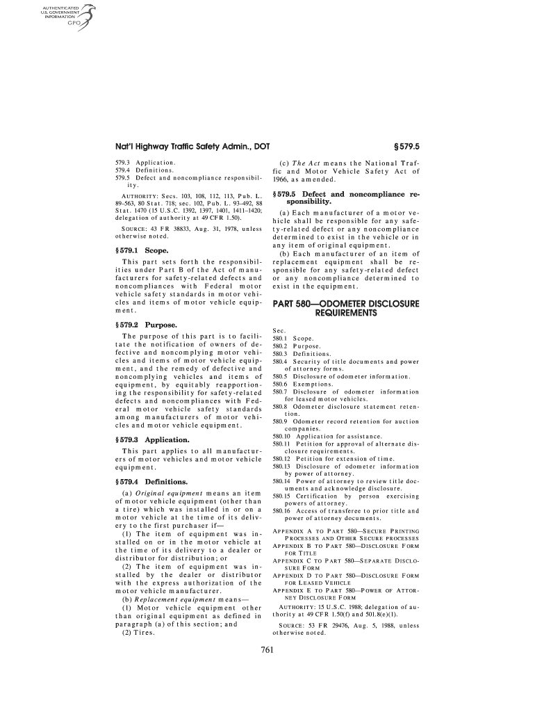 579.5 Defect and noncompliance responsibility.© The Act means the National Traffic and Motor Vehicle Safety Act