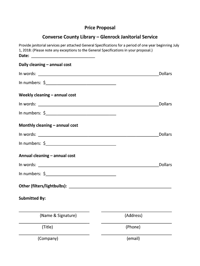 Price Proposal Converse County Library Glen rock Janitorial Service Provide janitorial services per attached General Specifications for a period of one year beginning July 1, 2018: (Please note any