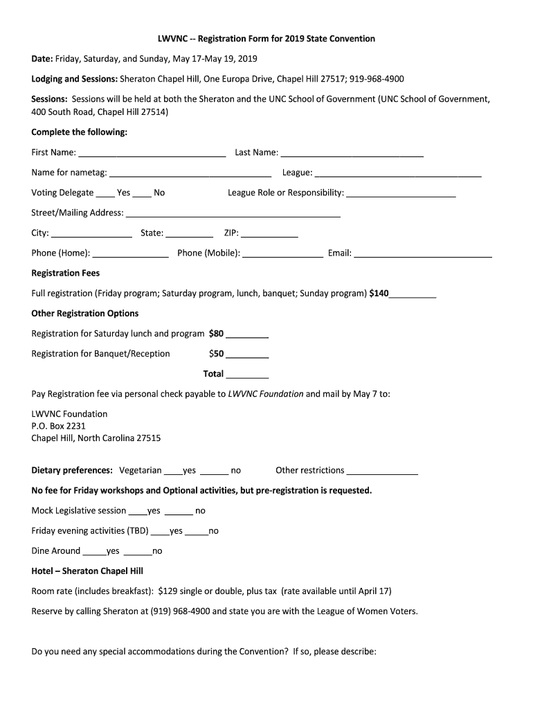 LVN Registration Form for 2019 State Convention Date: Friday, Saturday, and Sunday, May 17May 19, 2019 Lodging and Sessions: Sheraton Chapel Hill, One Europa Drive, Chapel Hill 27517; 9199684900 Sessions:
