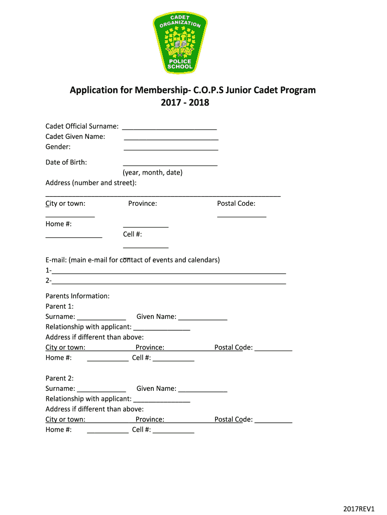 C.O.P.S. Junior Cadets Program 2017 2018Application Package Checklist Application ChecklistParentAdmin OfficerApplication for Membership Photocopy of Identification Photocopy of Health Card Photograph