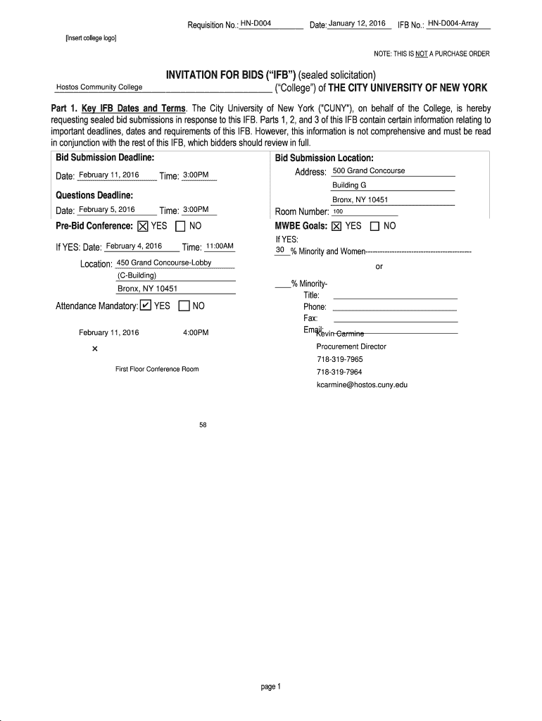 January 12, 2016 HND004 HND004Array Requisition No.: Date: IF No.: Insert college logo NOTE: THIS IS NOT A PURCHASE ORDERINVITATION FOR BIDS (IF) (sealed solicitation) (College) of THE CITY UNIVERSITY