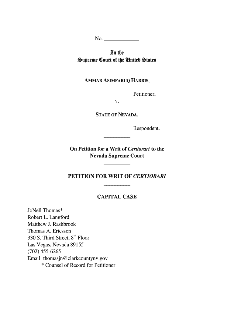 No. In the Supreme Court of the United States AMMAR ASIMFARUQ HARRIS, Petitioner, v. STATE OF NEVADA, Respondent. On Petition for a Writ of Certiorari to the Nevada Supreme Court PETITION FOR WRIT