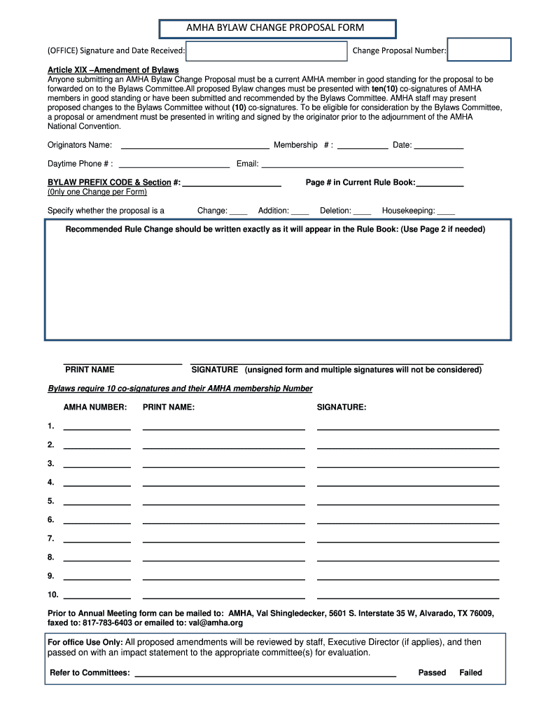 AMHABYLAWCHANGEPROPOSALFORM (OFFICE)SignatureandDateReceived:ChangeProposalNumber:Article XIX Amendment of Bylaws Anyone submitting an AMHA Bylaw Change Proposal must be a current AMHA member in good