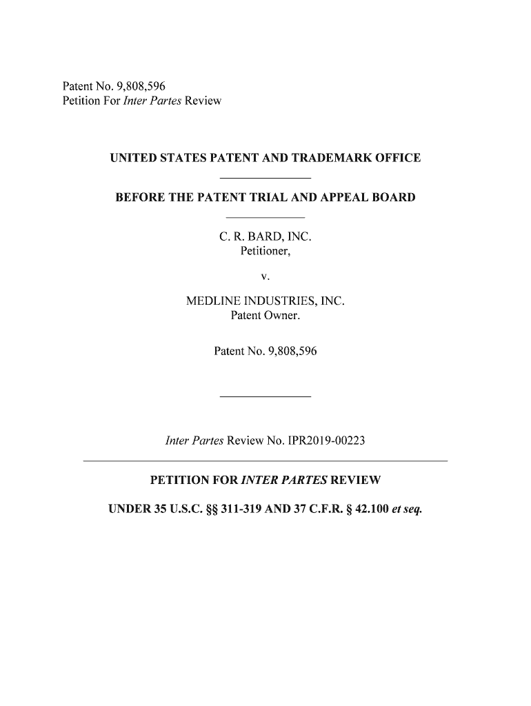 Patent No. 9,808,596 Petition For Inter Parties ReviewUNITED STATES PATENT AND TRADEMARK OFFICE BEFORE THE PATENT TRIAL AND APPEAL BOARD C. R. BARD, INC. Petitioner, v. EDLINE INDUSTRIES, INC. Patent