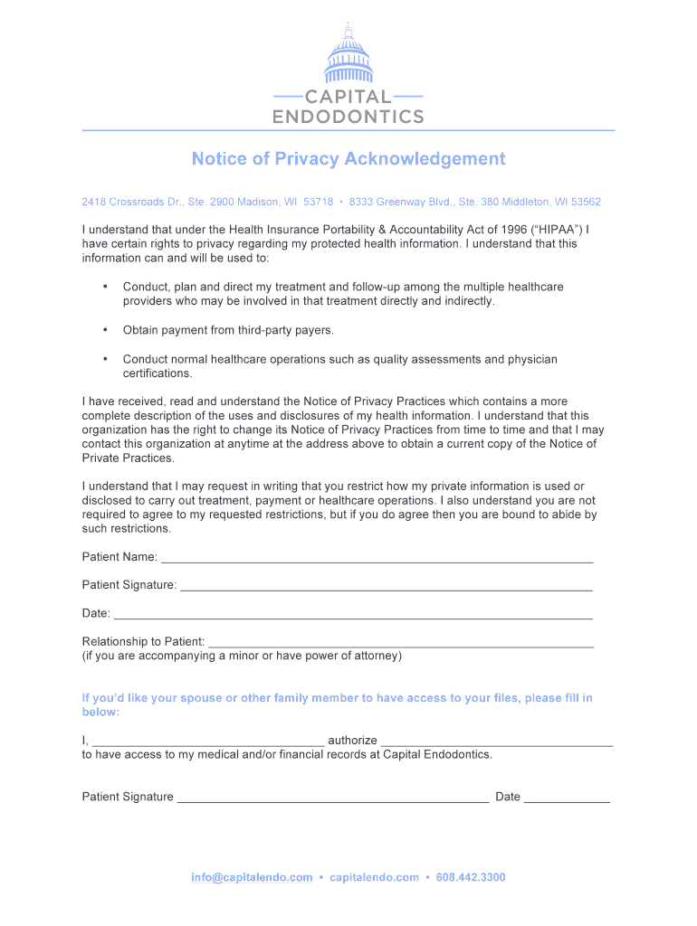 Get the free Notice of Privacy Acknowledgement - Capital Endo
