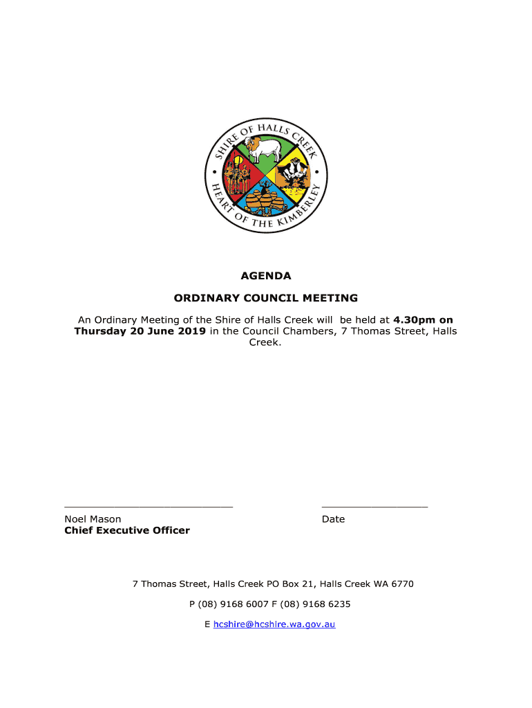 AGENDA ORDINARY COUNCIL MEETING An Ordinary Meeting of the Shire of Halls Creek will be held at 4.30pm on Thursday 20 June 2019 in the Council Chambers, 7 Thomas Street, Halls Creek. Noel Mason Chief