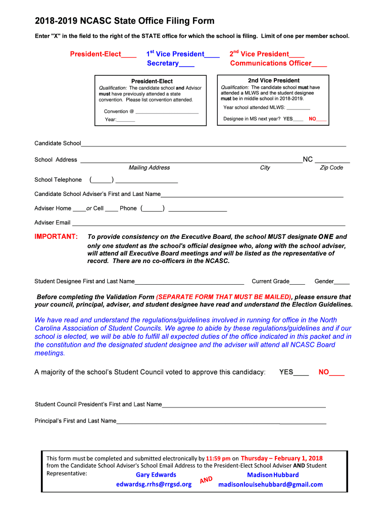 Invitation to Run for State or District Office North Carolina Association of Student CouncilsElectronic Filing Submission Deadline is 11:59 pm on Thursday, February 1, 2018, Dear NC ASC Member School: