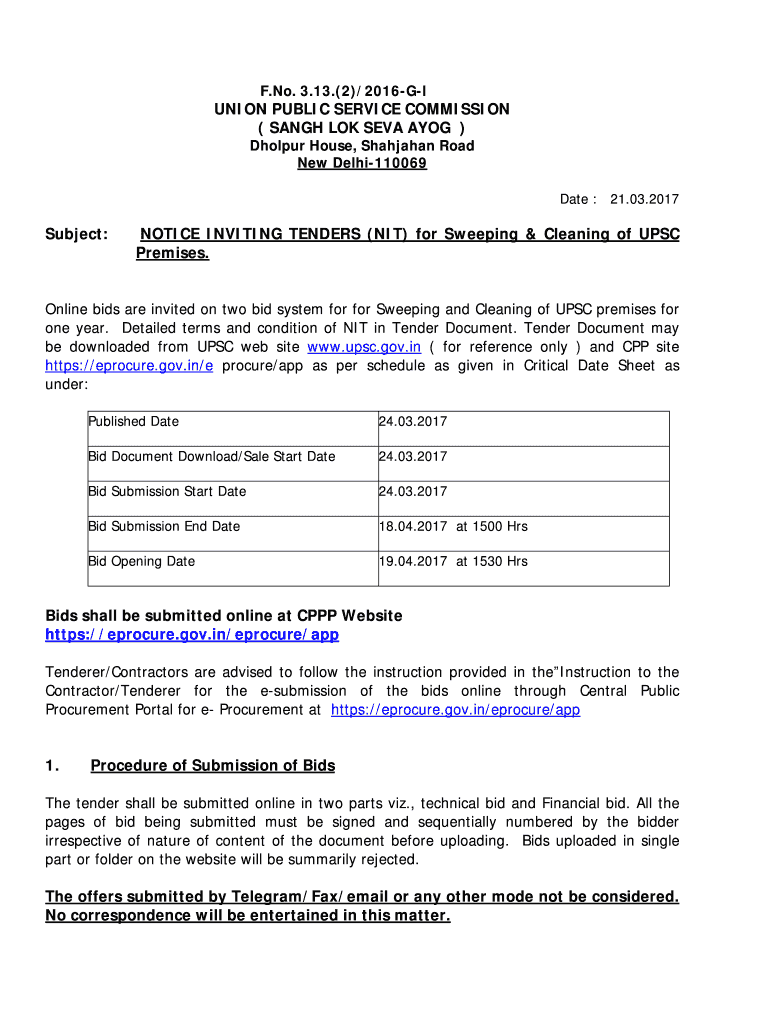 F. No. 3.13.(2)/2016GIUNION PUBLIC SERVICE COMMISSION (SANG OK SEA AGOG) Hour House, Shanahan Road New Delhi110069 Date : 21.03.2017Subject:NOTICE INVITING TENDERS (NIT) for Sweeping & Cleaning of