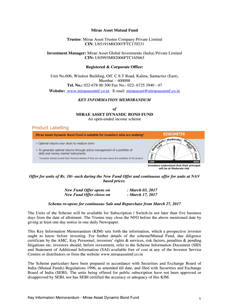 Mira Asset Mutual Fund Trustee: Mira Asset Trustee Company Private Limited IN: U65191MH2007FTC170231 Investment Manager: Mira Asset Global Investments (India) Private Limited IN: U65993MH2006FTC165663
