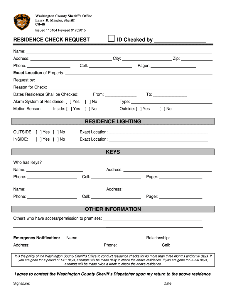 Washington County Sheriffs Office Larry R. Minks, Sheriff CR46 Issued 110104 Revised 01202015RESIDENCE CHECK REQUESTED Checked by Name: Address: City: Zip: Phone: Cell: Pager: Exact Location of Property: