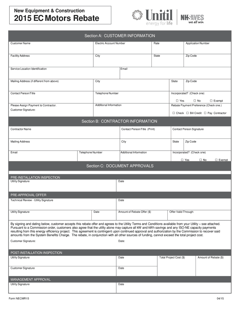 New Equipment & Construction2015 EC Motors Rebate Section A: CUSTOMER INFORMATION Customer Nonelectric Account NumberRateApplication NumberFacility AddressCityStateZip Preservice Location IdentificationEmailMailing