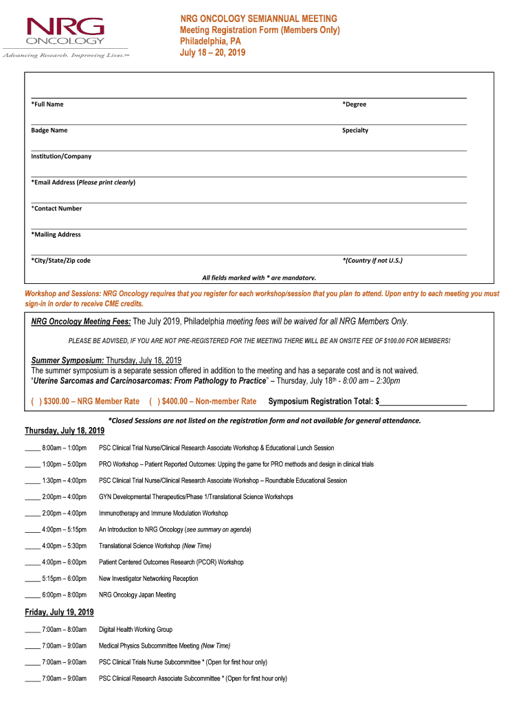 NRG ONCOLOGY SEMIANNUAL MEETING Registration Form (Members Only) Philadelphia, PA July 18 20, 2019×Full Name×DegreeBadge NameSpecialtyInstitution/Company×Email Address (Please print clearly)*Contact