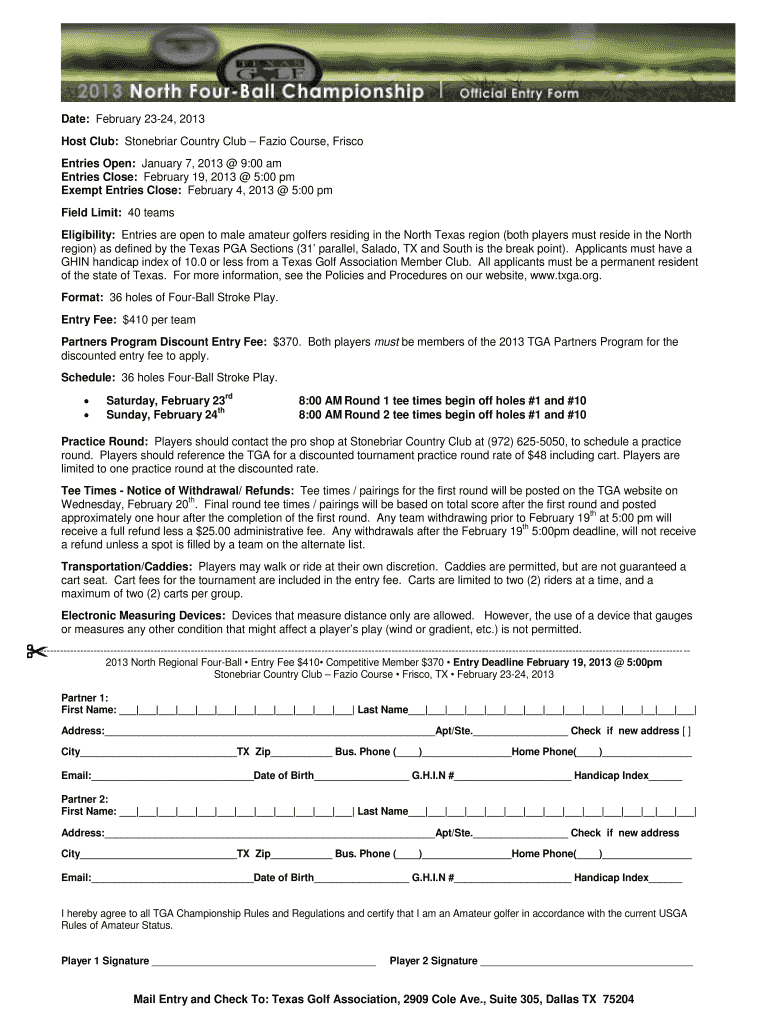 Date: February 2324, 2013 Host Club: Stonebriar Country Club Fabio Course, Frisco Entries Open: January 7, 2013 9:00 am Entries Close: February 19, 2013 5:00 pm Exempt Entries Close: February 4, 2013