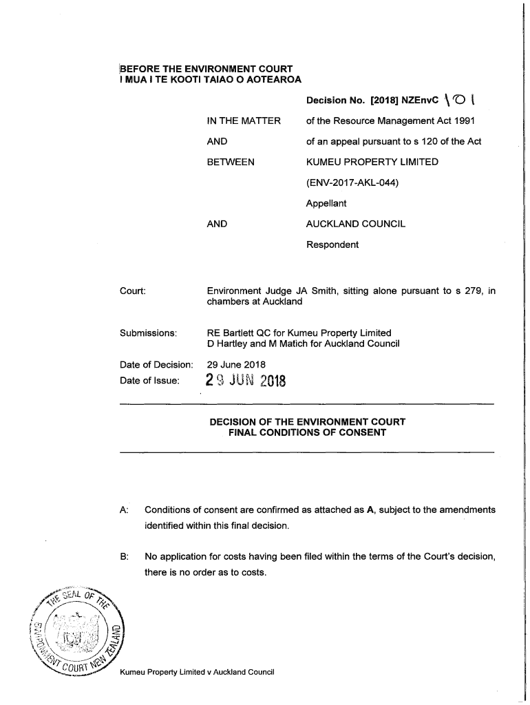 BEFORE THE ENVIRONMENT COURT I am I TE FOOT TA IAO 0 ACTEMRA Decision No. 2018 Nerve FM IN THE MATTER of the Resource Management Act 1991ANDof an appeal pursuant to s 120 of the ActBETWEENKUMEU PROPERTY