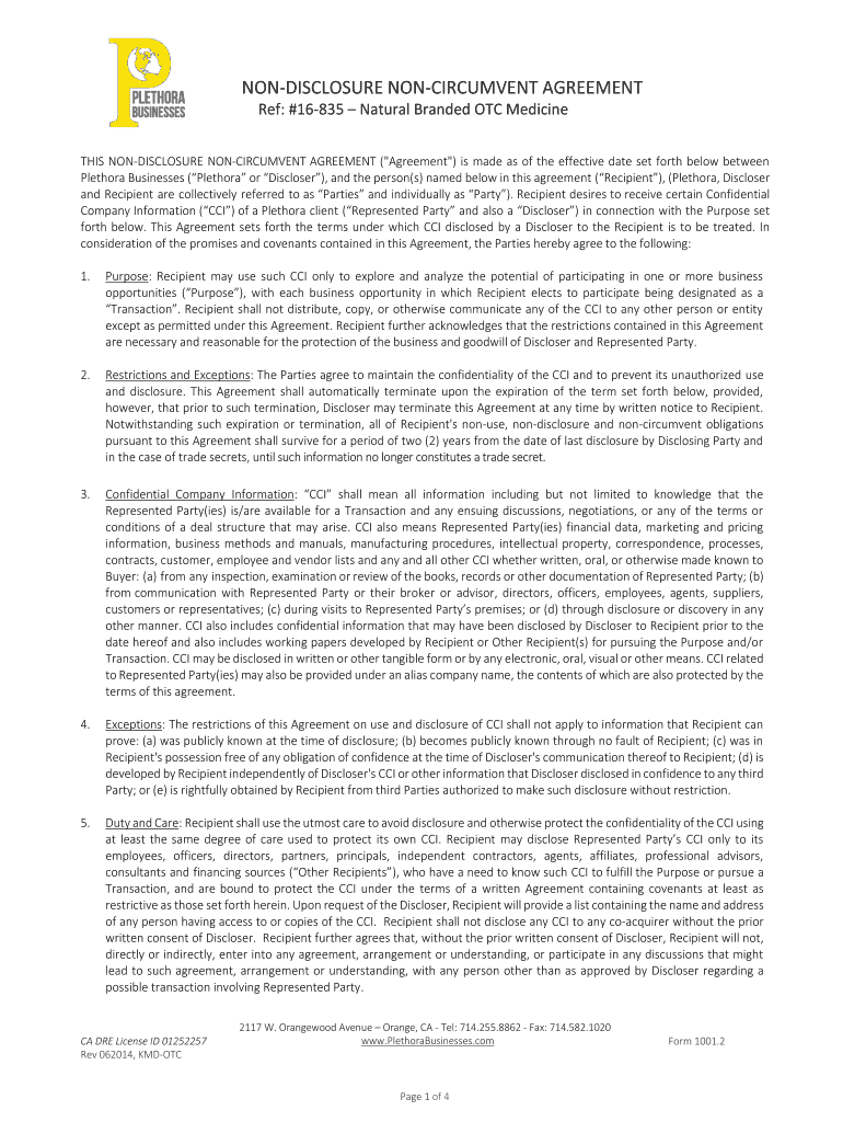 NONDISCLOSURE CIRCUMVENT AGREEMENT Ref: #16835 Natural Branded OTC Medicine THIS NONDISCLOSURE Circumvents AGREEMENT (“Agreement “) is made as of the effective date set forth below between Plethora