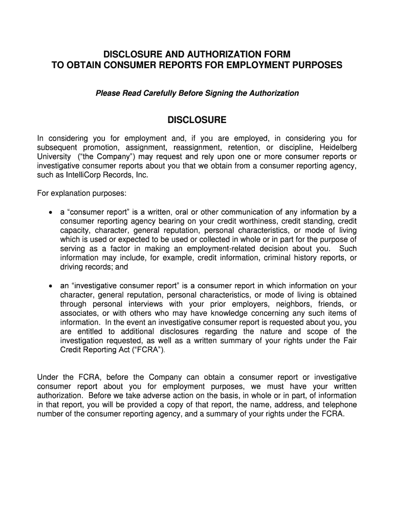 Get the free DISCLOSURE AND AUTHORIZATION FORM ... - inside.heidelberg.edu