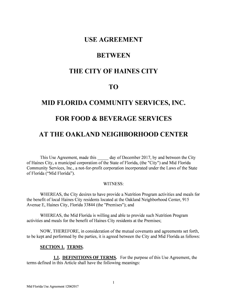USE AGREEMENT BETWEEN THE CITY OF HAINES CITY TO MID FLORIDA COMMUNITY SERVICES, INC. FOR FOOD & BEVERAGE SERVICES AT THE OAKLAND NEIGHBORHOOD CENTER This Use Agreement, made this day of December