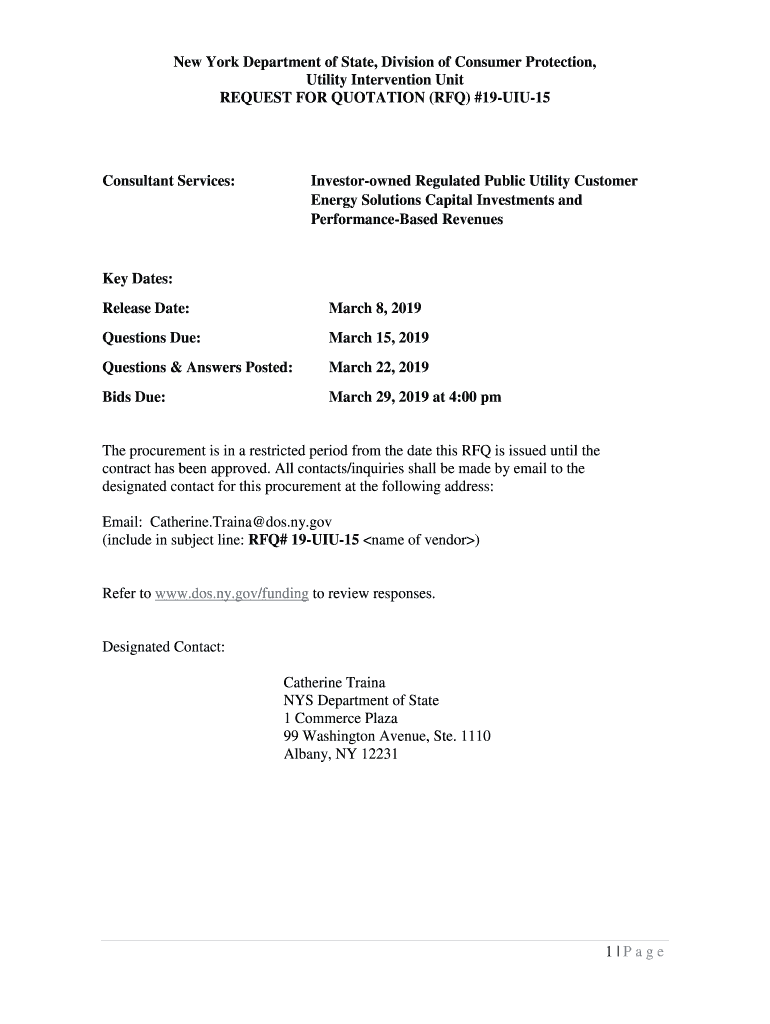 New York Department of State, Division of Consumer Protection, Utility Intervention Unit REQUEST FOR QUOTATION (RFQ) #19UIU15Consultant Services:Investor owned Regulated Public Utility Customer Energy