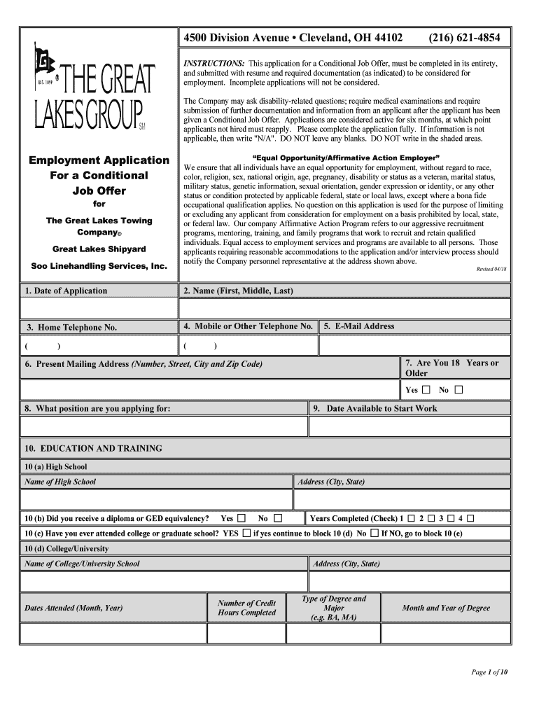 4500 Division Avenue Cleveland, OH 44102(216) 6214854INSTRUCTIONS: This application for a Conditional Job Offer, must be completed in its entirety, and submitted with resume and required documentation