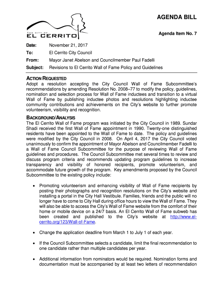 Date:November 21, 2017To:El Merritt City Councilor:Mayor Janet Abelson and Council member Paul FadelliSubject:Revisions to El Merritt Wall of Fame Policy and GuidelinesACTION
