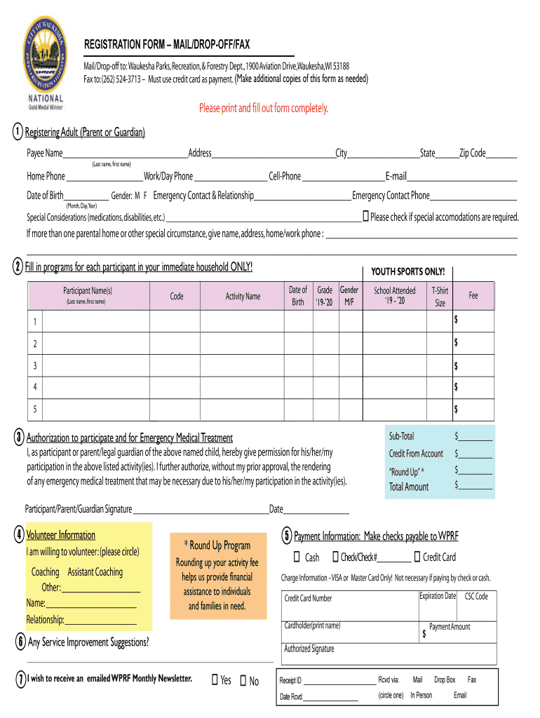 REGISTRATION FORM MAIL/DROP-OFF/FAX Mail/Drop-off to: Waukesha Parks, Recreation, & Forestry Dept., 1900 Aviation Drive, Waukesha, WI 53188 Fax to: (262) 5243713 Must use credit card as payment. (Make