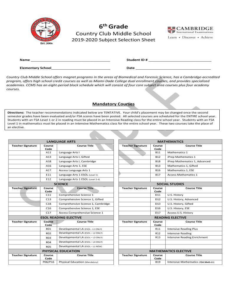 6th Grade Country Club Middle School 20192020 Subject Selection Sheena Student ID # Elementary School Date Country Club Middle School offers magnet programs in the areas of Biomedical and Forensic