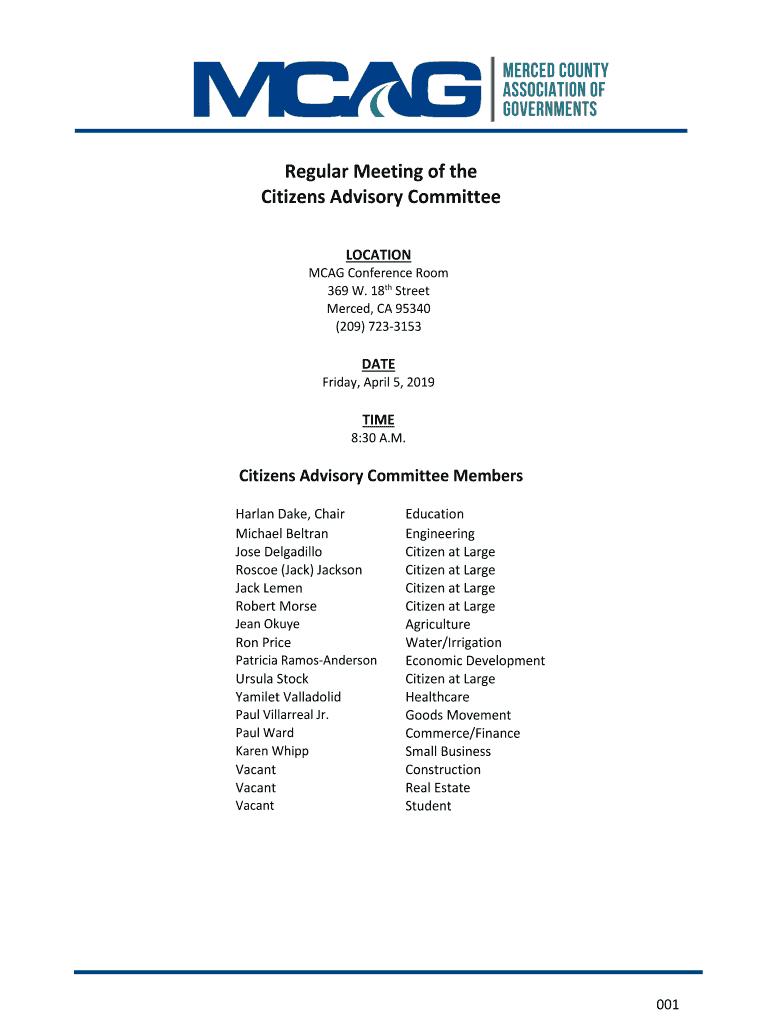 (209) 7233153DATEFriday, April 5, 2019TIME8:30 A.M. Citizens Advisory Committee Members